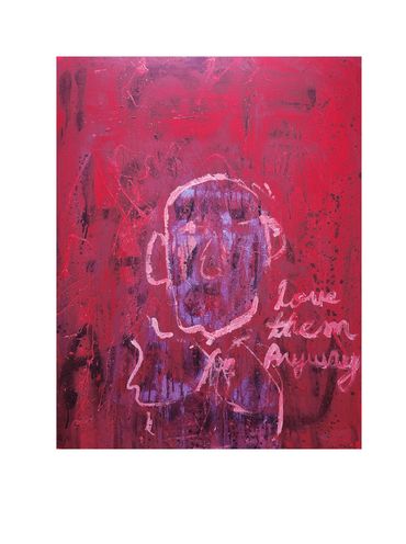 An abstract painting by Genesis, Acrylic mixed with spray paint. One is sick, the other hugs them.